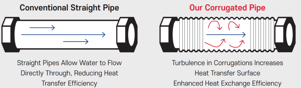 In addition, the periodic corrugations along the inner wall of the titanium tubes induce flow disturbance, repeatedly breaking down the boundary layer and thereby enhancing convective heat transfer performance. Under identical operating conditions, higher heat transfer efficiency can be expected compared to smooth tubes, reflecting a design approach that considers heat transfer mechanisms from the structural design stage.